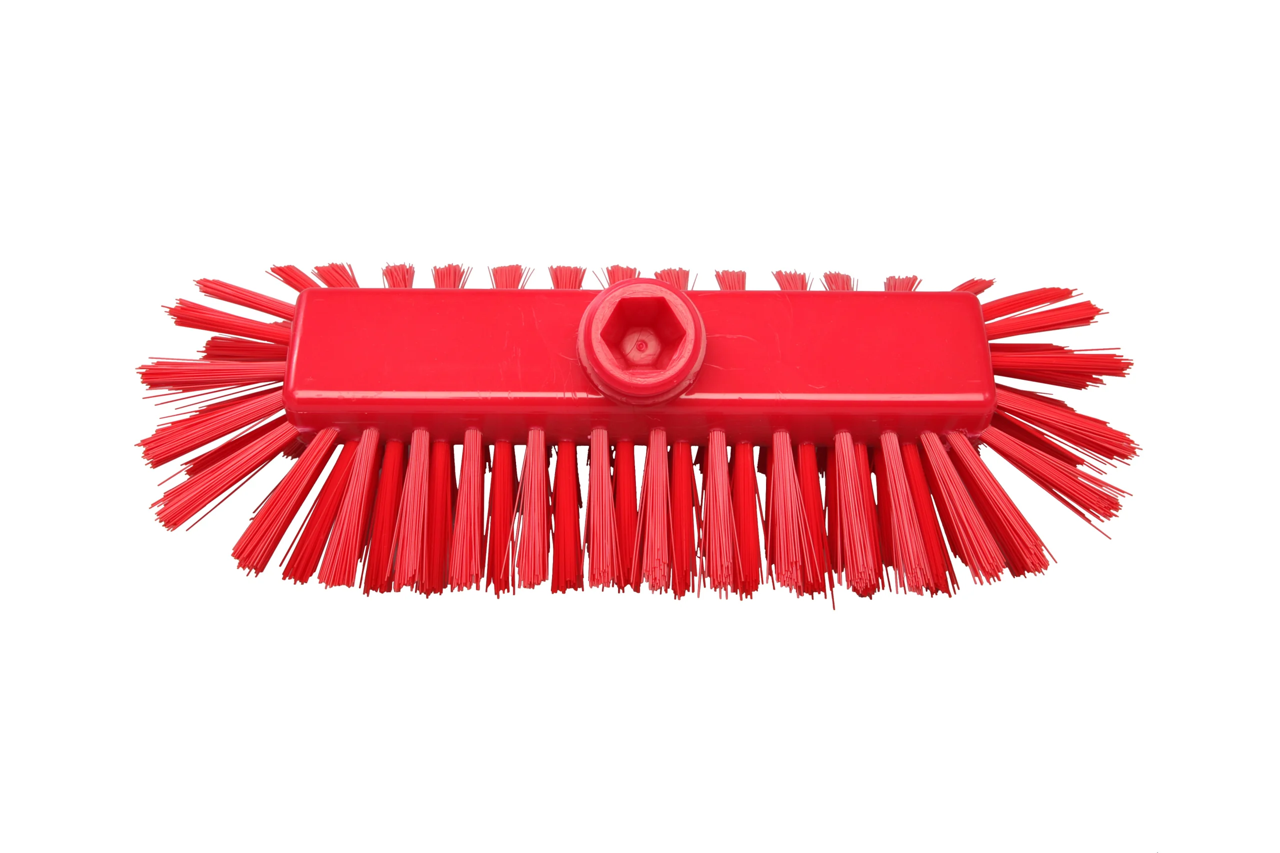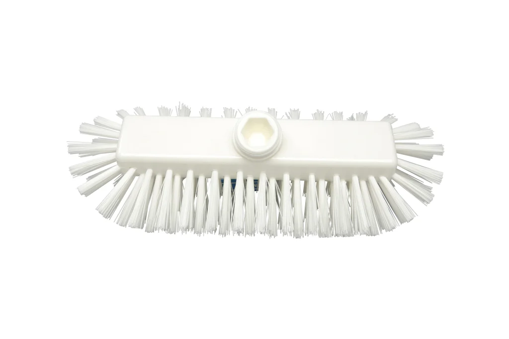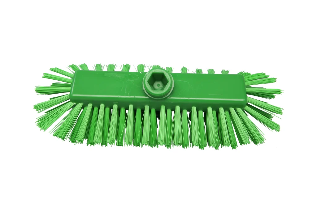 Cepillo de 285 x 120 mm con cerdas PBT de 0.50 mm, rígidas y de excelente durabilidad. El diseño incluye filamentos laterales que permiten una limpieza eficaz en esquinas, bordes y zonas complejas. Soporta temperaturas de hasta 80 °C en uso y 134 °C para procesos de esterilización. Compatible con mangos de rosca externa sin paso de agua.
