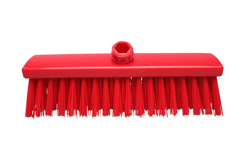 Escoba compacta con filamentos rígidos extralargos, ideal para áreas pequeñas o de difícil acceso que requieren limpieza fuerte y precisa en suelos.