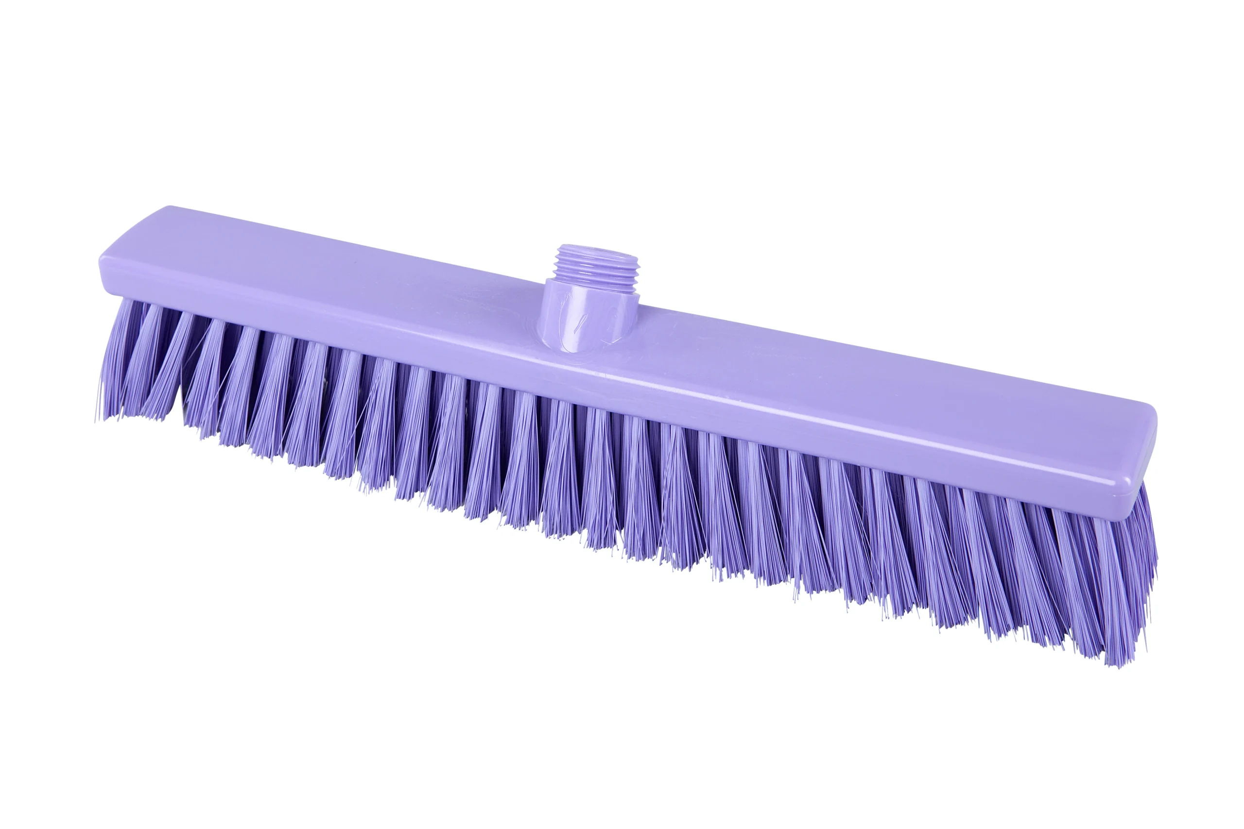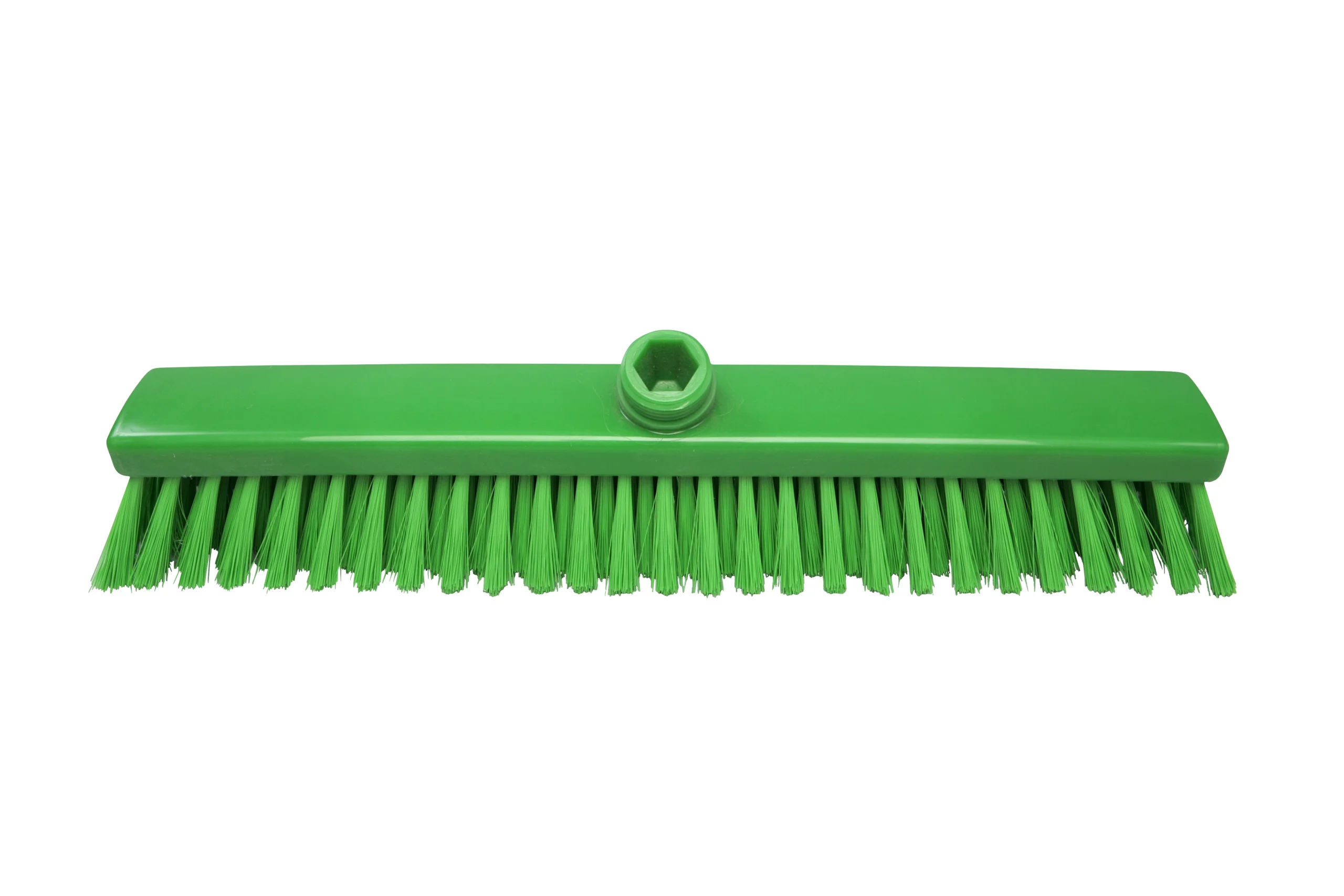 Escoba fabricada en polipropileno resistente, con filamentos de poliéster PBT de 0.30 mm y 55 mm de largo, seleccionados para un cepillado suave ideal para la mayoría de aplicaciones de limpieza ligera en suelos. Compatible con mangos de rosca externa estándar.