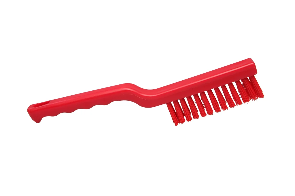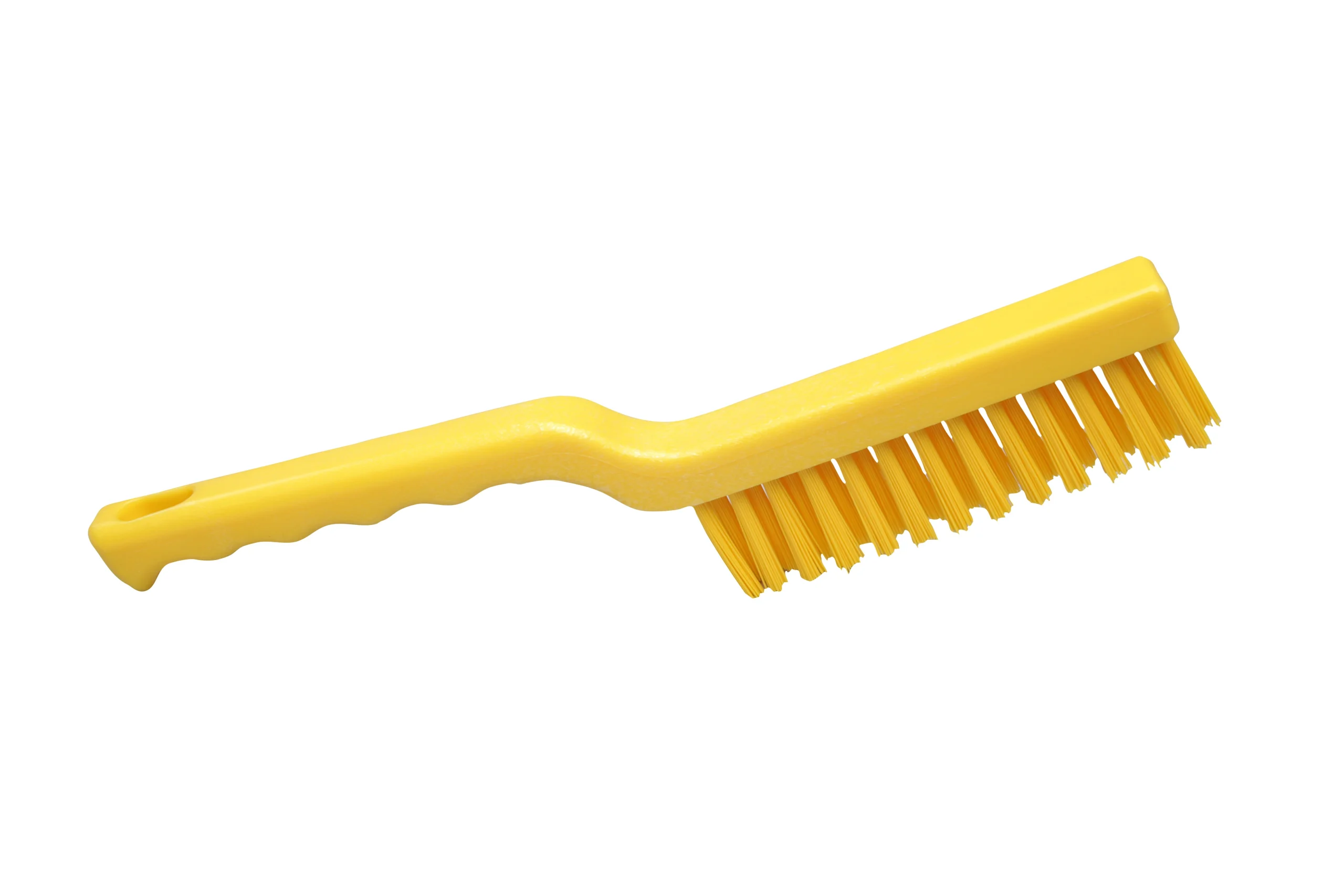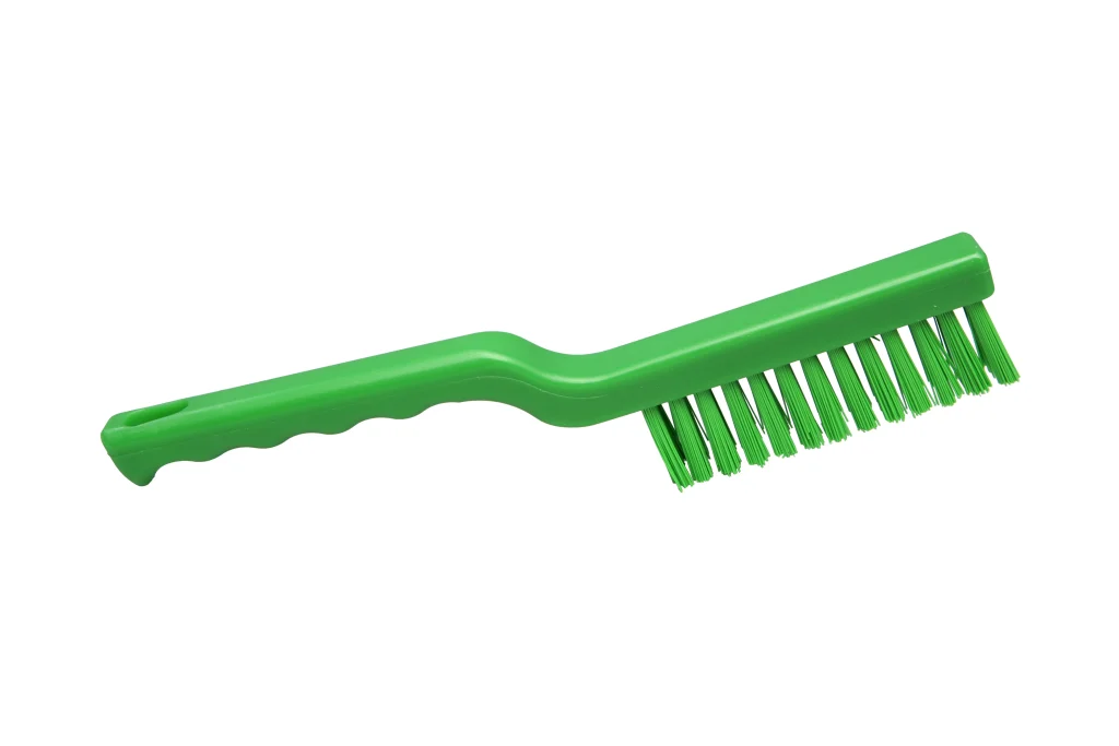 Cepillo de mano para limpieza de maquinaria, con cerdas duras de PBT 0.50 y mango de polipropileno. Tamaño compacto, rigidez y maniobrabilidad especializada en la limpieza de residuos difíciles en todo tipo de espacios técnicos sin comprometer durabilidad. Uso recomendado hasta 80 °C. Esterilizable a 134 °C.