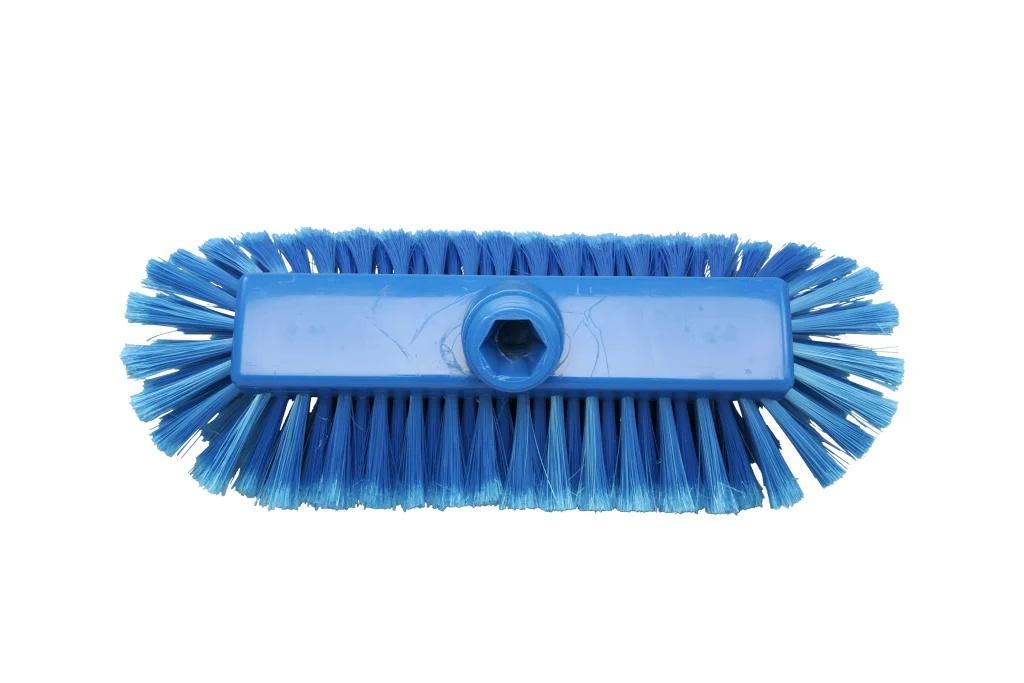 Escobillón para lavar con paso de agua y cerdas laterales, 290 x 130 mm. Tiene cerdas suaves despuntadas de PBT 0.30 mm de 40 mm de altura. Ideal para superficies delicadas y para llegar a esquinas de difícil acceso. Compatible con mangos de rosca externa con paso de agua.