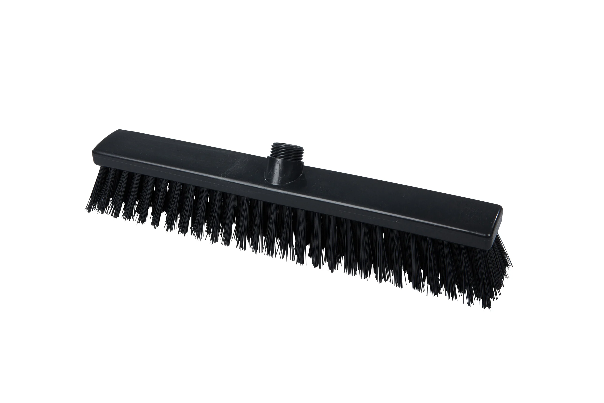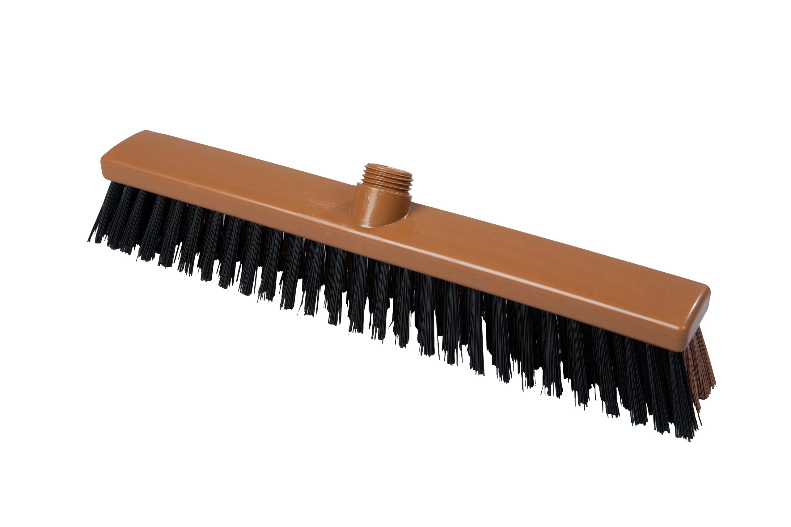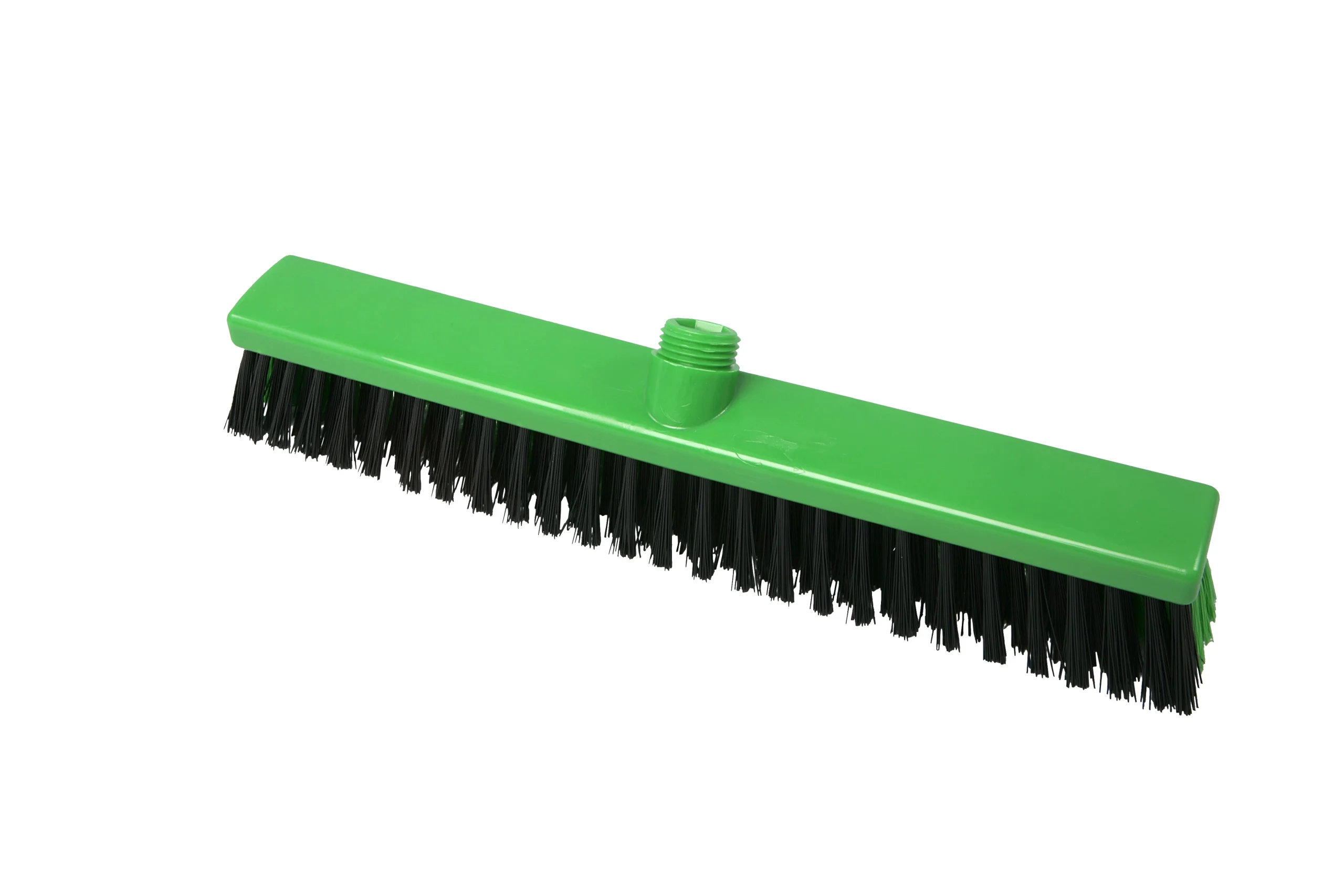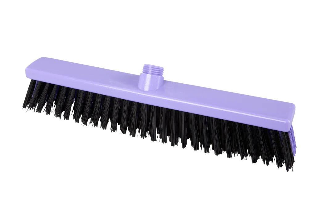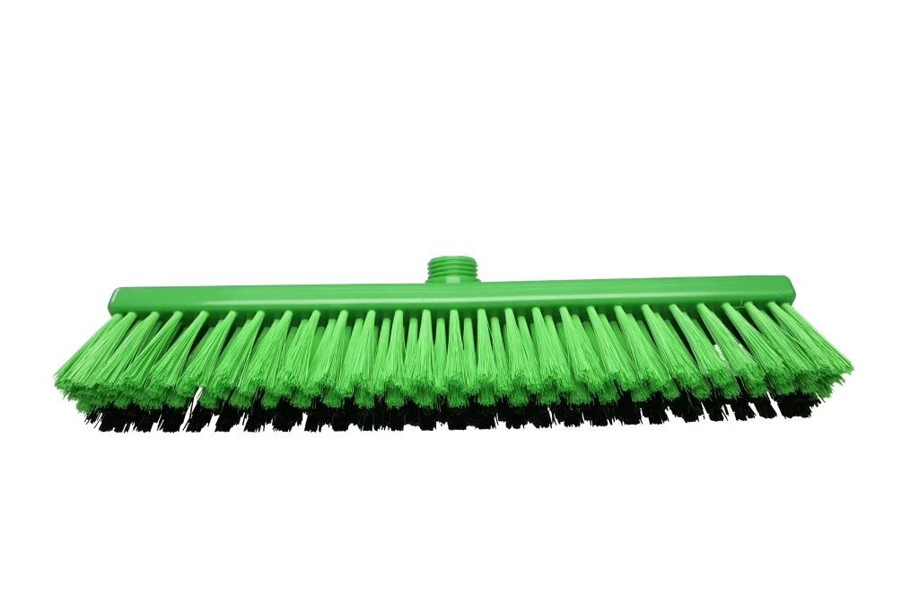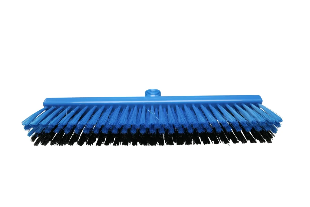 Escobillones combinados fabricados en polipropileno con filamentos de PBT en dos rigideces. Los filamentos frontales negros (0.70 mm) eliminan residuos incrustados, mientras que los posteriores más suaves (0.30 mm) capturan partículas finas. Ideal para una limpieza eficiente en pisos que combinan suciedad pesada con residuos livianos. Resistencia térmica de hasta 80 °C en uso y 134 °C para esterilización. Compatibles con mangos de rosca externa.