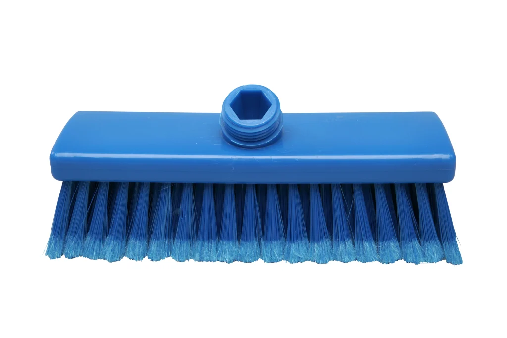 Cepillo para lavar sin paso de agua. Sus cerdas largas de 55 mm lo hacen ideal para la limpieza húmeda de pisos, y su diseño simple lo vuelve una opción versátil, permitiendo también su uso en seco. Fabricado en polipropileno con filamentos de PBT resistentes a un uso intenso sin deformaciones. Compatible con mango estándar de rosca externa (sin paso de agua).