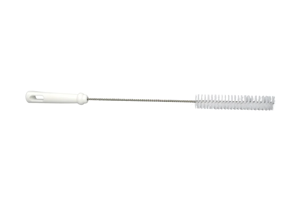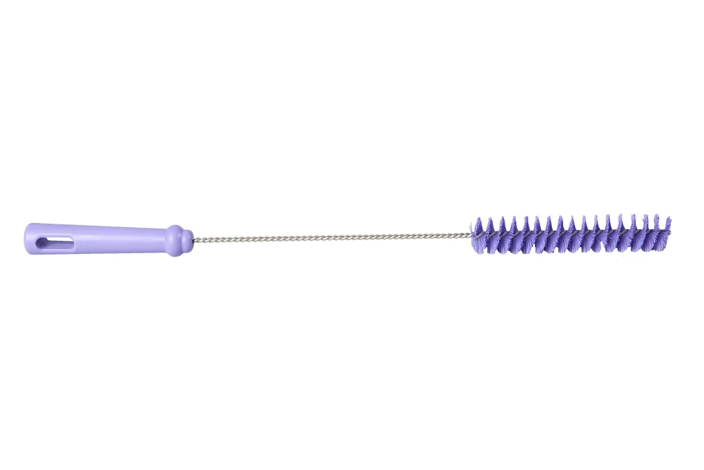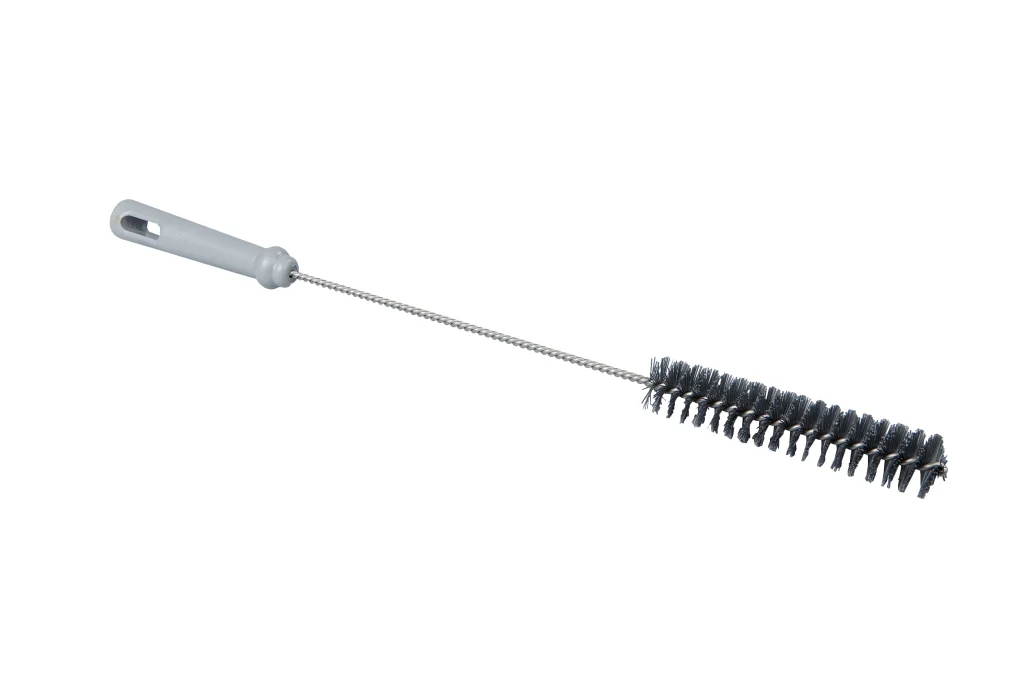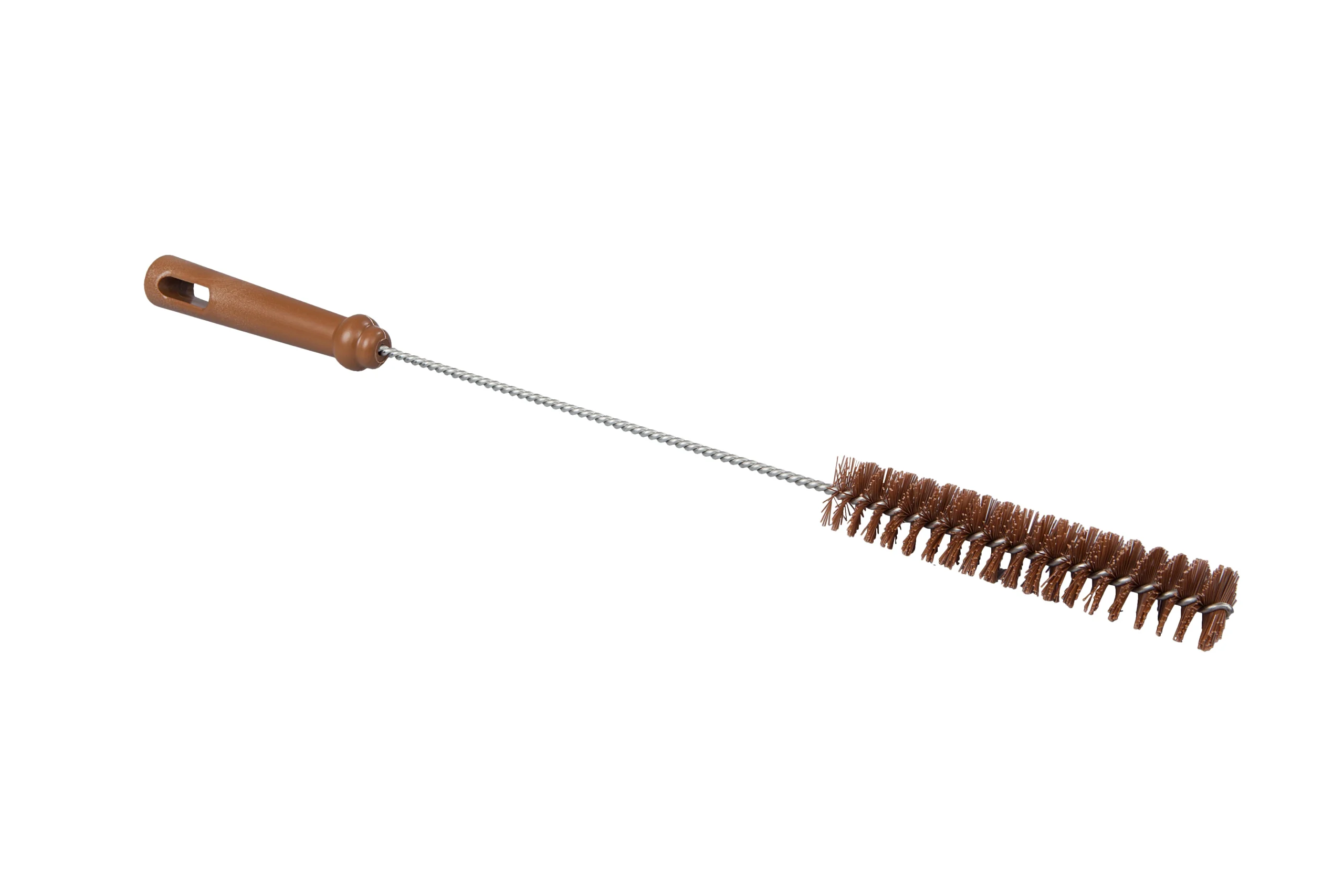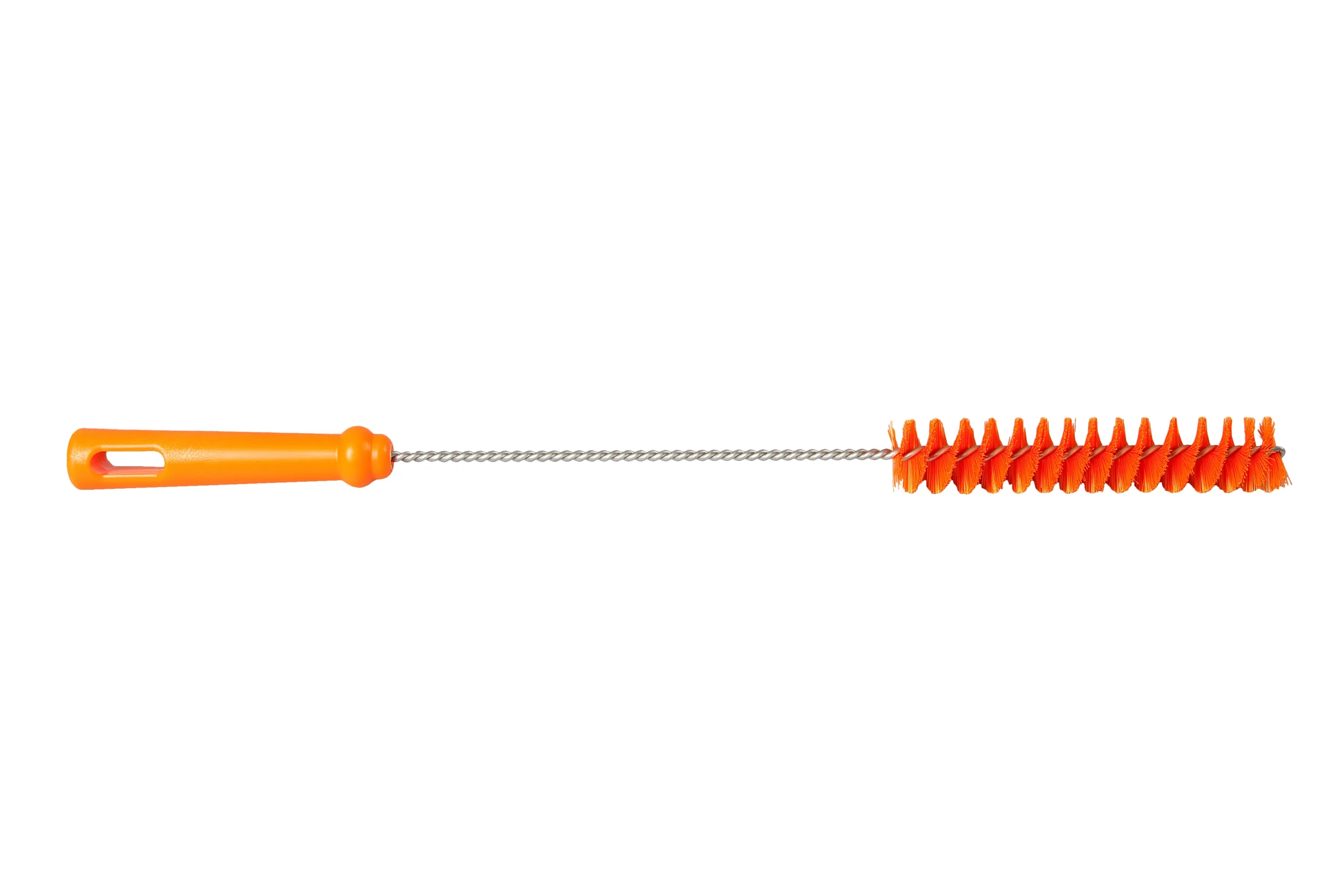 Cepillo de mano con mango largo y filamentos de poliéster PBT de dureza media, con radio de 30 mm. Indicado para tuberías medianas, permite acceder con facilidad para remover residuos y mantener la higiene en espacios estrechos y exigentes.