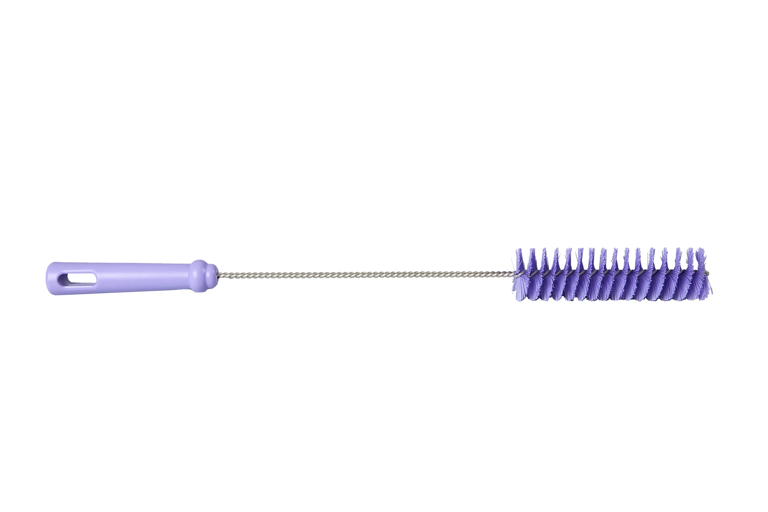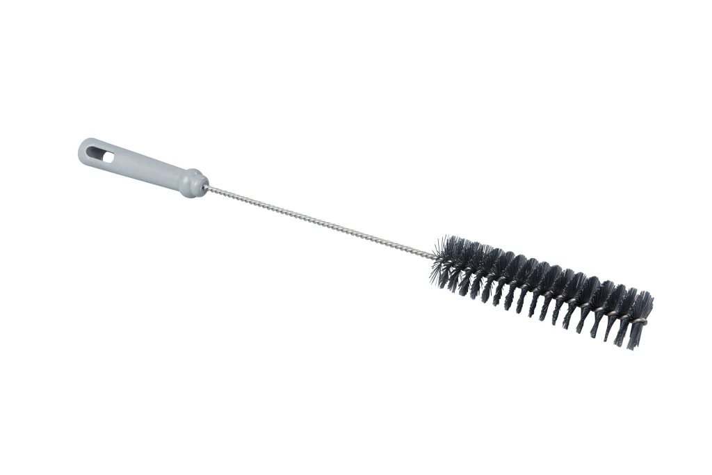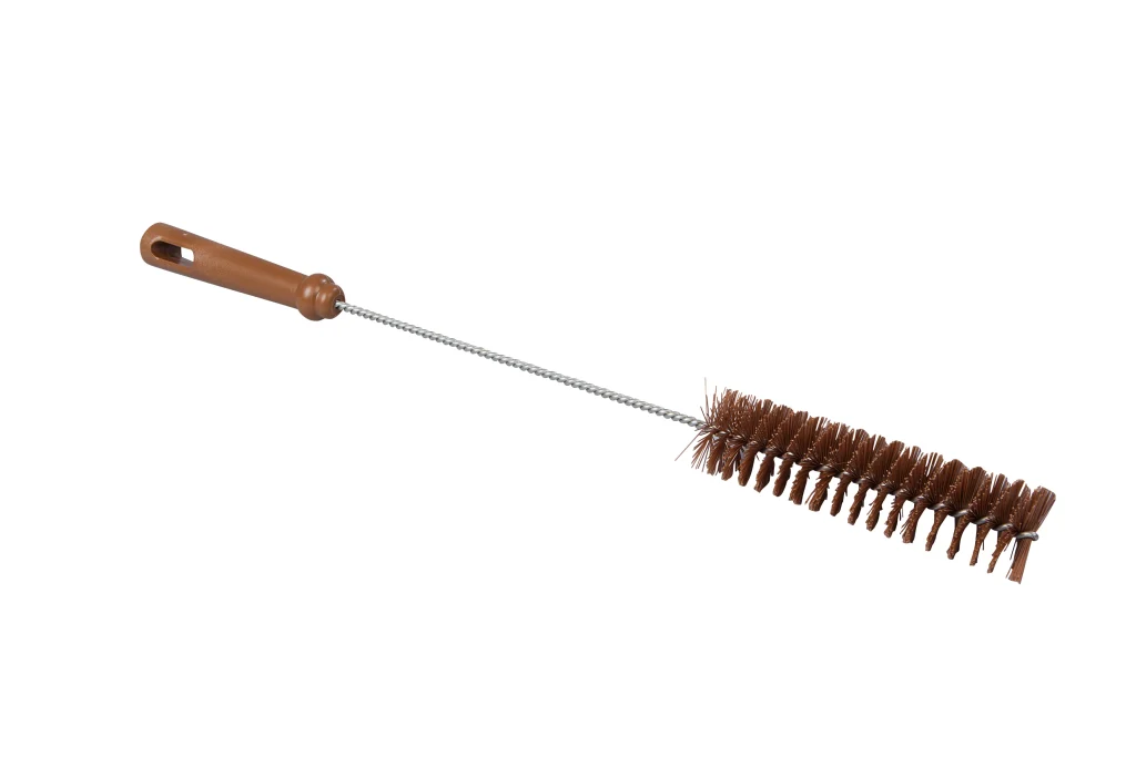 Cepillo de mano con mango largo y filamentos de poliéster PBT de dureza media, con radio de 40 mm. Indicado para tuberías medianas, permite acceder con facilidad para remover residuos y mantener la higiene en espacios estrechos y exigentes.