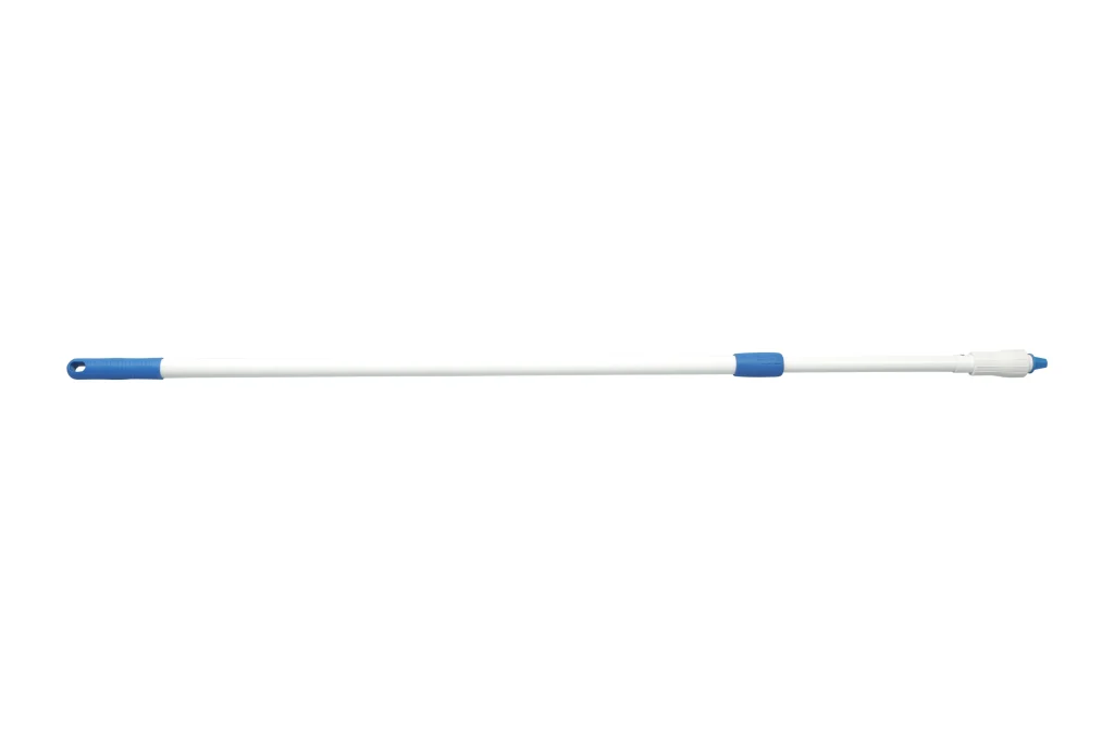 Mangos telescópicos de fibra de vidrio, altamente resistentes a impactos, productos químicos y corrosión. Su diseño extensible permite adaptar el largo según el uso, facilitando el acceso a zonas en altura o de difícil acceso. Son más livianos que los de aluminio, lo que mejora la maniobrabilidad sin sacrificar rigidez ni control. Superficie blanca fácil de limpiar, empuñadura azul antideslizante y conexión compatible con artículos de rosca externa. Soportan temperaturas de hasta 100 °C.