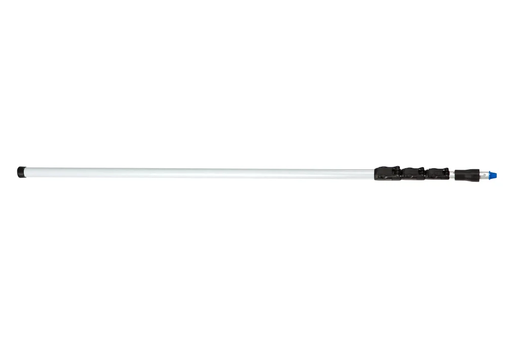 Mango telescópico extra fuerte de fibra de vidrio, ajustable de 1600 a 5300 mm. Ideal para limpieza en altura o profundidad moderada. Sistema de rosca externa.