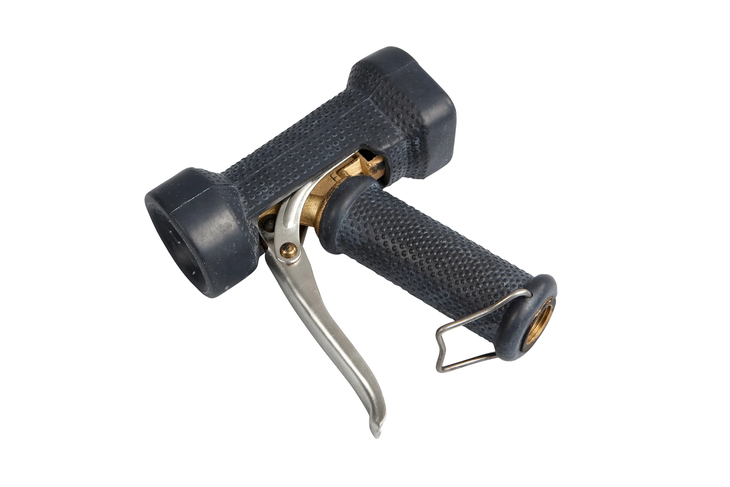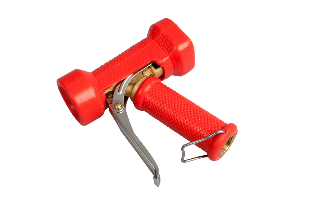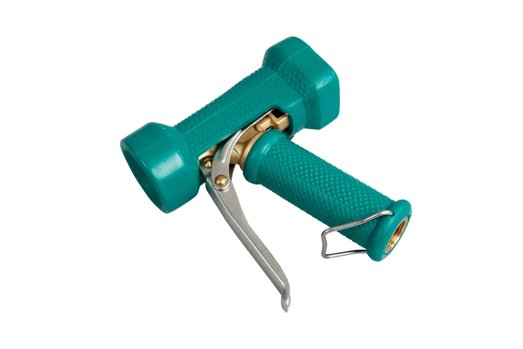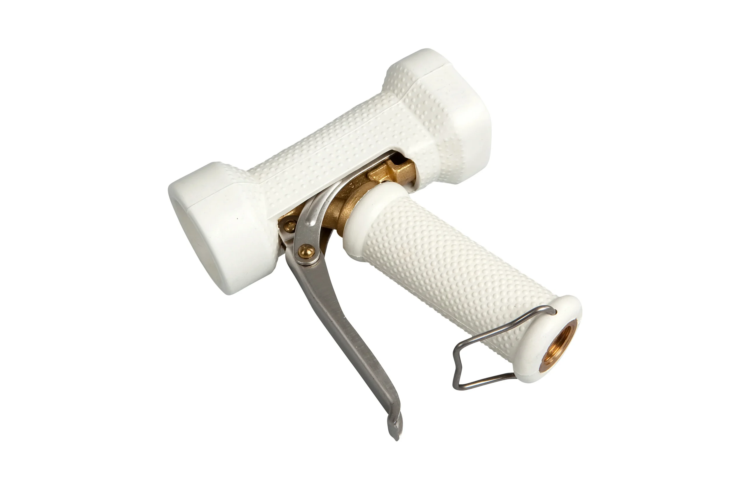 Pistola de agua industrial disponible en múltiples colores, con cuerpo de latón, ideal para limpieza húmeda en procesos exigentes. Su diseño compacto y liviano mejora la maniobrabilidad, mientras la boquilla plana FBK entrega un chorro uniforme, sin goteo y regulable. Altamente duradera, resistente a 24 bar y 95 °C, con uso eficiente del agua. Compatible con acople de ½”.