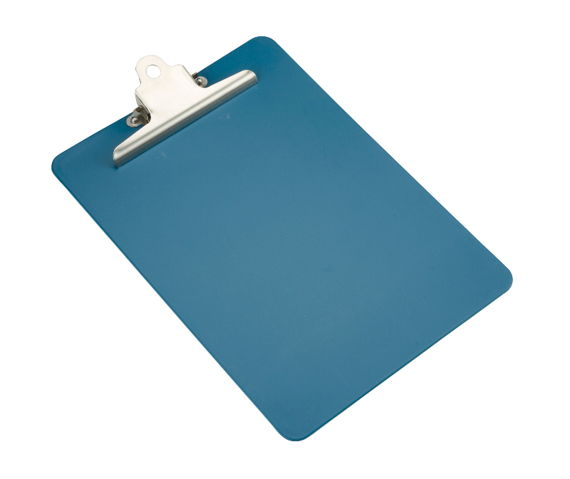 Portapapeles detectable por metal y rayos X, fabricado en plástico aprobado para contacto con alimentos. Tiene clip de acero inoxidable, diseño vertical y superficie rígida. Ideal para zonas de producción donde se requiere manipulación segura de documentación.